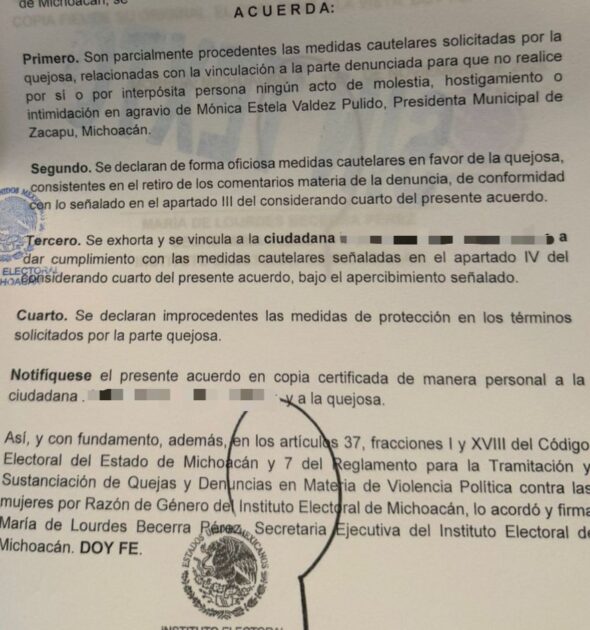Zacapu Michoacán a 20 de noviembre de 2025.- El Instituto Electoral de Michoacán (IEM) emitió medidas cautelares a favor de la presidenta municipal de Zacapu, Monica Estela Valdez Pulido, tras vivir actos de hostigamiento e intimidación.