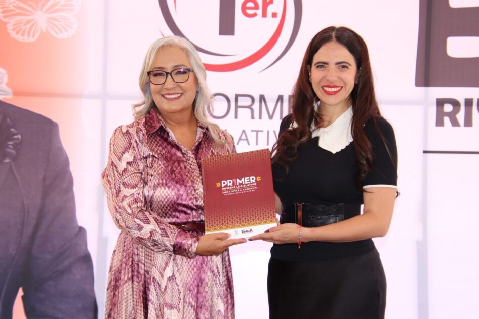 Acompañada por la Diputada lider de la bancada de Morena en el Congreso, Fabiola Alanís Sámano y la presidenta de la Mesa Directiva del Congreso del Estado, Giulianna Bugarini Torres, a quien entregó formalmente el documento de su trabajo, Emma Rivera evocó el espíritu de la transformación que hoy vive México.