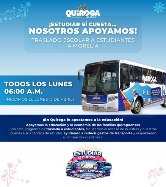 El servicio iniciará este lunes 13 de abril, con salidas todos los lunes a las 6:00 de la mañana desde la Presidencia Municipal de Quiroga, permitiendo a las y los estudiantes trasladarse de manera segura y gratuita a la capital del estado.