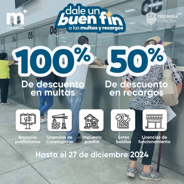 En este sentido y hasta el 27 de diciembre, los contribuyentes obtendrán descuentos en multas y recargos en diferentes conceptos, como 100% en multas y 50% en recargos en impuestos predial, lotes baldíos, falta de banqueta, anuncios publicitarios, licencias de funcionamiento e ISAÍ (Adquisición de inmuebles).