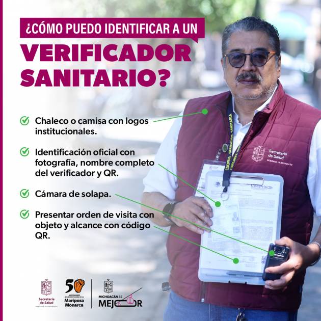 Morelia, Michoacán, 19 de marzo de 2025.- La Comisión Estatal para la Protección contra Riesgos Sanitarios de Michoacán (Coepris) informa a la población y a los establecimientos comerciales sobre cómo identificar correctamente a las o los verificadores sanitarios autorizados, con el objetivo de prevenir fraudes y evitar caer en manos de falsos inspectores.