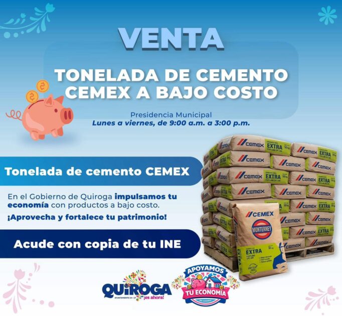 Quiroga, Michoacán, a 15 de abril del 2026.– Con el objetivo de apoyar la economía familiar y fortalecer el patrimonio de las y los quiroguenses, la presidenta municipal, Alma Mireya González Sánchez, anunció la disponibilidad de cemento a bajo costo como parte de los programas sociales que impulsa su administración.