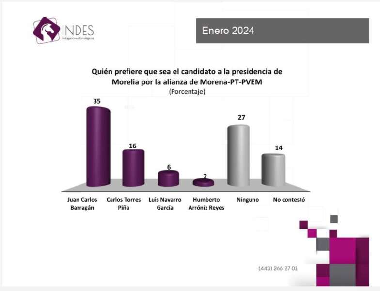 Morelia, Michoacán, a 28 de febrero de 2024.- Al levantar una nueva encuesta, la empresa INDES, vuelve a posicionar a Juan Carlos Barragán Vélez como el favorito de Morena por la presidencia municipal de Morelia.