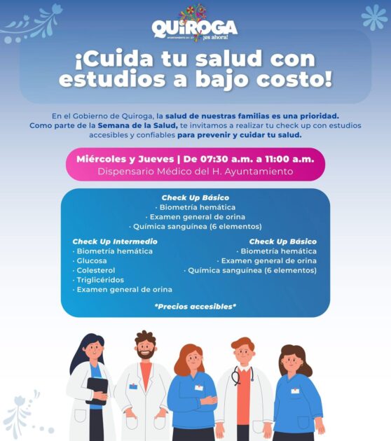 Quiroga, Michoacán, a 14 abril de 2026.- Con el objetivo de fomentar la prevención y el cuidado oportuno de la salud, la presidenta municipal de Quiroga, Alma Mireya González Sánchez, invita a la población a participar en la jornada de estudios médicos a bajo costo que se realiza en el municipio.