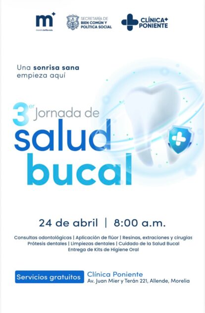 Morelia, Michoacán; 22 de abril de 2026.- Como parte de las acciones impulsadas por el presidente municipal Alfonso Martínez Alcázar para acercar servicios gratuitos y fortalecer el bienestar de la población, el Gobierno de Morelia invita a la ciudadanía a participar en la 3ª Jornada de Salud Bucal, donde se brindará atención odontológica gratuita para bebés, niñas, niños, jóvenes, personas adultas y adultas mayores.