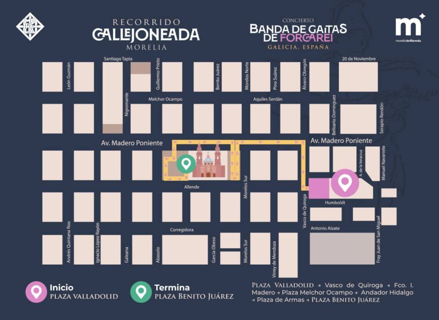 La callejoneada estará acompañada por el talento internacional de la Banda de Gaitas de Forcarei, proveniente de Galicia, España, quienes llenarán de ritmo y tradición cada rincón del trayecto, generando una experiencia cultural enriquecedora tanto para locales como turistas. Esta agrupación es reconocida por preservar y difundir la tradición musical gallega a través de presentaciones que combinan identidad, energía y un espectáculo sonoro que ha llevado su música a escenarios nacionales e internacionales. Su presencia en Morelia representa una oportunidad única para disfrutar de una expresión artística de gran prestigio, que llenará de vida y tradición las calles del Centro Histórico