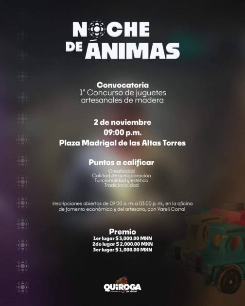 Quiroga, Michoacán, a 30 de octubre 2024.- A fin de promover la creatividad y la habilidad artesanal en la elaboración de juguetes hechos a mano, el Gobierno de Quiroga invita a participar al Concurso de Juguetes Artesanales de Madera que se efectuará el próximo 2 de noviembre, en la Plaza Madrigal de las Altas Torres, en punto de las 9:00 a.m.