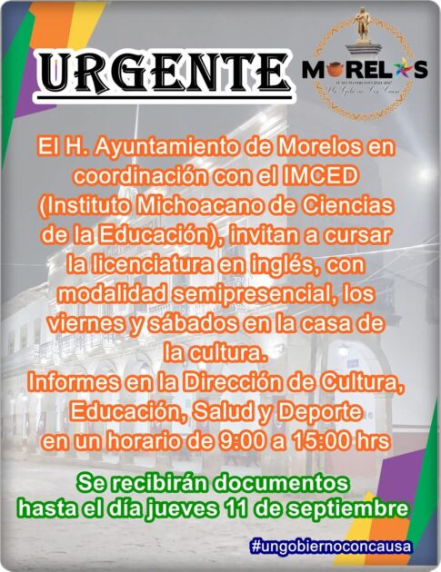Villa Morelos, Michoacán, a 10 de septiembre 2025.- Con el objetivo de acercar más oportunidades de educación superior a la juventud morelense, el Ayuntamiento de Morelos, en coordinación con el Instituto Michoacano de Ciencias de la Educación (IMCED), abrió la convocatoria para cursar la Licenciatura en Inglés en modalidad semipresencial.