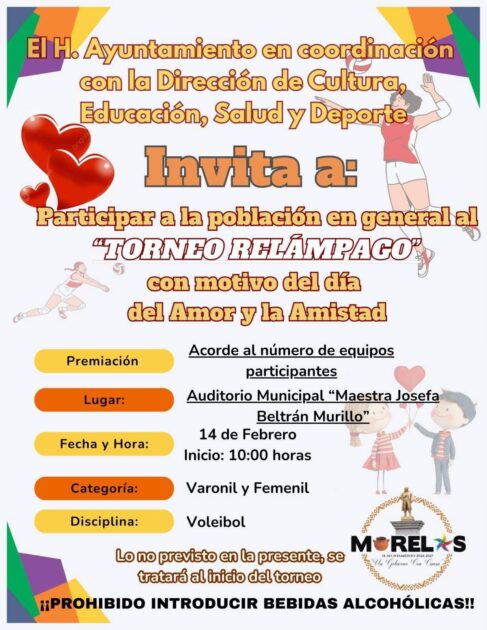 En este marco, el Ayuntamiento de Morelos, en coordinación con la Dirección de Cultura, Educación, Salud y Deporte, invita a la población en general a participar en el “Torneo Relámpago de Voleibol”, que se realizará con motivo del Día del Amor y la Amistad, fomentando la sana competencia y la integración comunitaria.