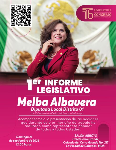 La Piedad, Michoacán, a 19 de Septiembre 2025.-La diputada local Melba Albavera Padilla, representante del Distrito 01 con cabecera en La Piedad, invita a las y los ciudadanos a acompañarla en la rendición de cuentas de su Primer Informe Legislativo, a realizarse el próximo 21 de septiembre en punto de las 12:00 horas, en el Salón Arroyo, ubicado en la Calzada del Cerro Grande No. 217, La Piedad, Michoacán.