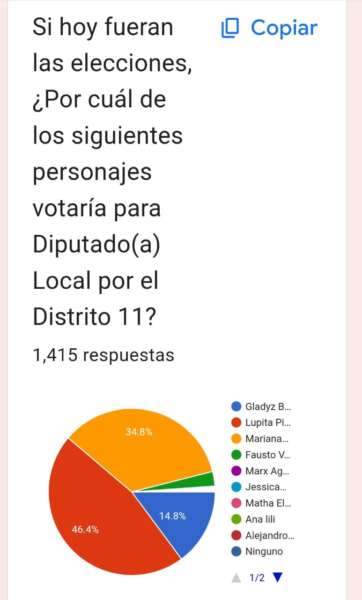 De acuerdo con una de las encuestas aplicada en redes sociales, la aspirante a coordinar el distrito 11 encabezó la preferencia con un 46.4 por ciento.