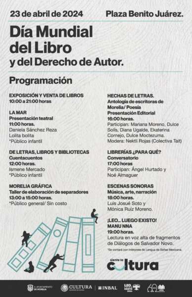 Morelia, Michoacán a 22 de abril de 2024 – Este próximo martes 23 de abril, la Secretaría de Cultura de Morelia invita a todas y todos los morelianos, así como a los visitantes de la ciudad, a celebrar el Día Mundial del Libro y el Derecho de Autor con una variada y especial agenda de actividades.