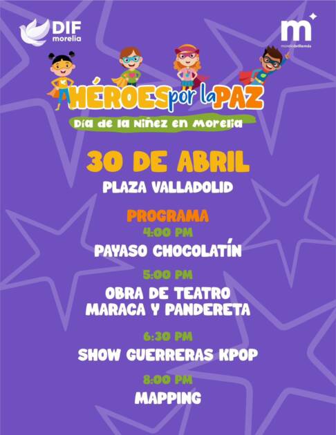 Morelia, Michoacán; 29 de abril de 2026.- La Presidenta del DIF Morelia, Paola Delgadillo Hernández, invita a las familias morelianas a celebrar el Día de la Niñez en el evento de cierre del programa “Héroes por la Paz”, que se llevará a cabo este jueves 30 de abril en la Plaza Valladolid (San Francisco), con acceso gratuito y actividades dirigidas a niñas y niños.