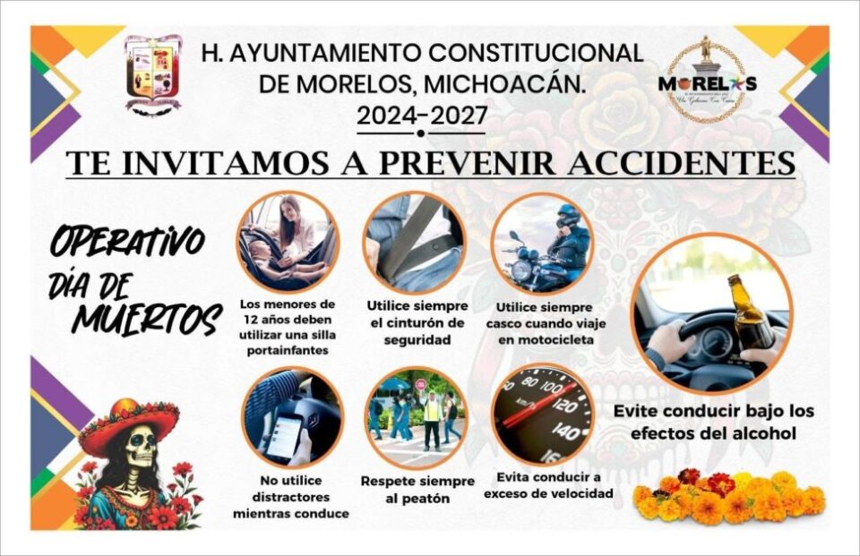 Villa Morelos, Michoacán, a 30 de octubre 2025.-Con el objetivo de salvaguardar la integridad de las familias durante las festividades del Día de Muertos, el presidente municipal, Julio César Conejo Alejos, informó que el Ayuntamiento de Morelos, a través de la Dirección de Seguridad Pública y Tránsito, implementará un operativo especial de prevención de accidentes en todo el municipio.