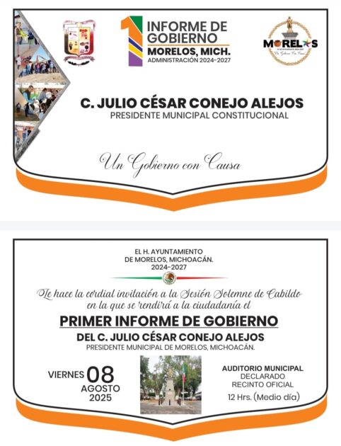 Villa Morelos, Michoacán, a 4 de agosto 2025.- Este viernes 8 de agosto, el presidente municipal de Morelos, Julio César Conejo Alejos, presentará su Primer Informe de Gobierno en un acto público que se llevará a cabo al mediodía en el Auditorio Municipal.