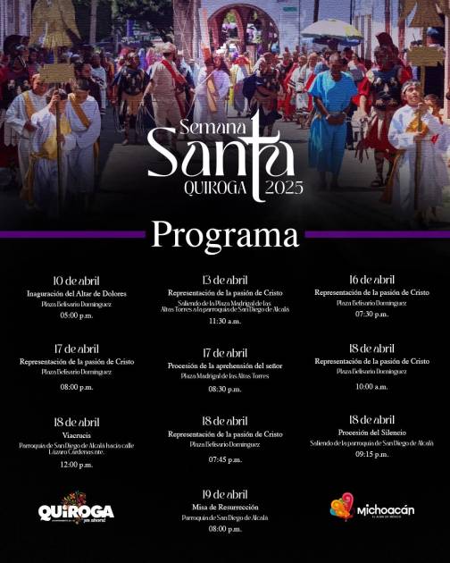 En este marco, el Ayuntamiento de Quiroga, encabezado por la presidenta municipal, Alma Mireya González Sánchez, ha preparado una serie de actividades conmemorativas que se llevarán a cabo del 10 al 19 de abril, y que invitan tanto a habitantes como a visitantes a vivir estas fechas desde la reflexión, el arte y la comunidad.