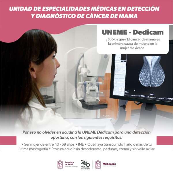 Morelia, Michoacán a 25 de agosto de 2024.- La Unidad de Especialidades Médicas Dedicada a la Detección del Cáncer de Mama (Uneme Dedicam), de la Secretaría de Salud de Michoacán (SSM), brinda servicios de detección y diagnóstico de manera gratuita.