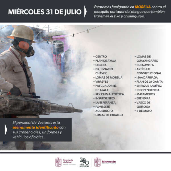 Personal del Departamento de Vectores, plenamente acreditado con sus identificaciones oficiales y uniformes, recorrerá a partir de las 5:00 horas las colonias Centro, Plan de Ayala, Obrera, Dr. Ignacio Chávez, Lomas de Morelia, Virreyes, Rey Chimalpopoca, Plan de la Garita y Pascual Ortiz de Ayala.