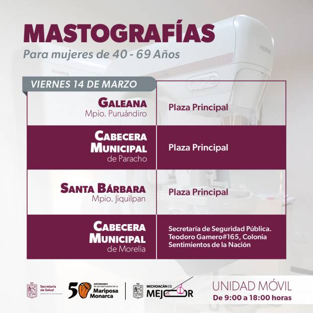 Morelia, Michoacán, a 9 de marzo de 2025.- A partir del lunes 10 de marzo, unidades móviles de mastografía de la Secretaría de Salud de Michoacán (SSM), recorrerán 8 municipios de la entidad, con el fin de realizar estudios gratuitos de mama a mujeres de 40 a 69 años de comunidades alejadas.