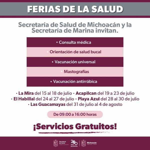 Lázaro Cárdenas, Michoacán a 23 de julio de 2024.- Del 24 al 27 de julio, las secretarías de Salud de Michoacán (SSM) y de Marina (Semar) invitan a la feria de la salud, en la tenencia El Habillal, de Lázaro Cárdenas, donde ofrecerá consultas médicas gratuitas, dentales y de nutrición, estudios de laboratorio y medicamentos a la población abierta.