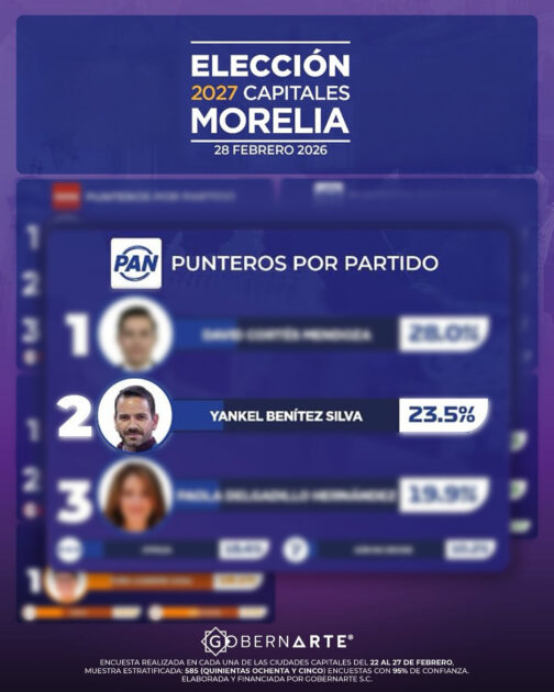 De acuerdo al más reciente estudio del mes de febrero que presentó Gobernarte, Yankel Benítez cerró los primeros lugares con el también aspirante, David Cortés y la presidenta del DIF de Morelia, Paola Delgadillo.